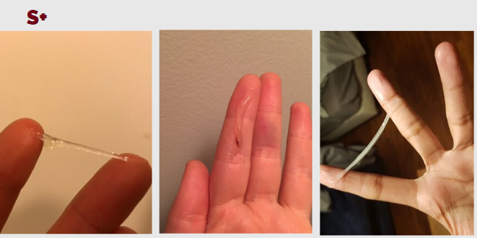 Pri teh slikah pa lahko opazimo to zelo opevano plodno sluz, raztegljivo, prozorno, jajčnemu beljaku podobno sluz. Po Sensiplan kategoriji spada pod S+ kategorijo.